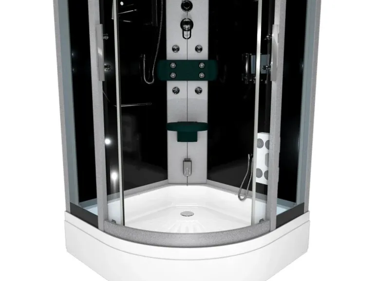 Natürlich ist auch eine Ozonreinigung / Ozondesinfektion (tötet Viren und Bakterien ab) eingebaut. An der Computersteuerung können Sie diese Funktion ganz einfach aktivieren Die Wanne besteht aus weißem verstärkten hochwertigen Sanitäracryl. Unter der Wanne befindet sich eine zusätzliche Faserverbindplatte und ein Stahlrahmen mit einstellbaren Füßen. Diese werden zum standsicheren Aufbau der Dusche einzeln in der Höhe eingestellt. Natürlich enthält dies Dusche eine passende Ablaufgarnitur. Besonders wichtig bei Sanitärartikeln sind natürlich die verwendeten Materialien. Da gehen wir keinerlei Kompromisse ein. Verwendet wird bei dieser Dusche nur hochwertigeres Einscheibensicherheitsglas. Die Rahmenkonstruktion ist komplett aus Aluminium. Natürlich ist auch das gesamte Duschpaneel massiv und im ganzen aus Aluminium gefertigt. Die Duschtasse ist aus dickem Sanitär- Acryl das zusätzlich Glasfaserverstärkt wurde. Die Duschtasse steht auf einem sehr stabilen Stahlrahmen mit einzeln einstellbaren Füßen. Dieser Duschtempel kann durch zwei Personen leicht aufgebaut werden. Ganz wichtig dabei ist das man diese Dusche UNBEDINGT zu Zweit aufbauen sollte, die dicken Glasscheiben sind wirklich schwer und Sie brauchen immer mal jemanden der hält. Für einen schnellen Aufbau und reibungslosen Betrieb der Dusche ist diese mit allen erforderlichen Dichtungen ausgestattet. Der Einsatz von Silikon gehört weitestgehend der Vergangenheit an.