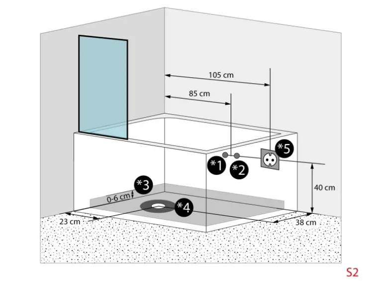 – Anschluss-Maße (Skizze S2): *1 Warm- und *2 Kaltwasser, auch gegenüberliegend möglich, *3 Bereich für Abflussrohre, *4 freier Bereich um den Abfluss-Siphon, *5 Stromanschluss nur Variante mit Whirlpool/AIR