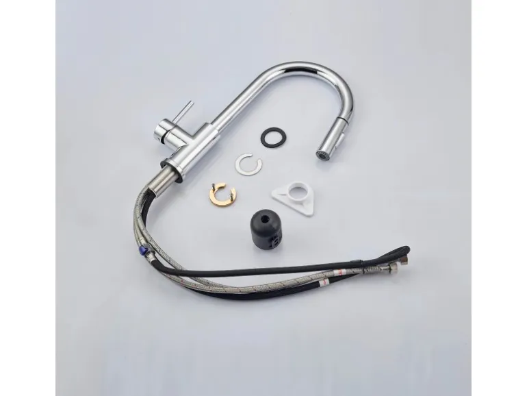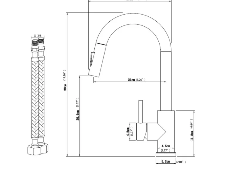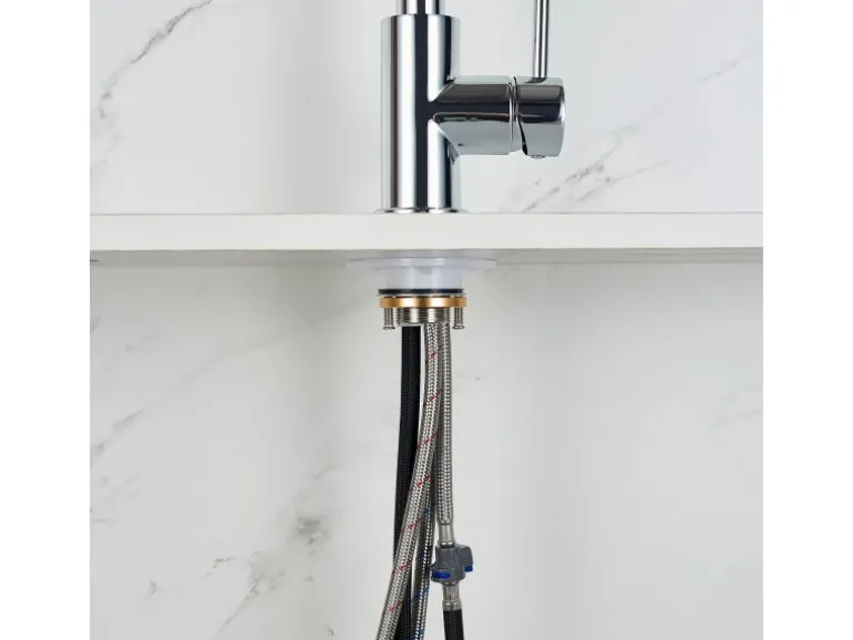 Lieferumfang: 1x Küchenarmatur, 2x Flexible Anschlussschläuche G3/8″, 1x Installationspaket.