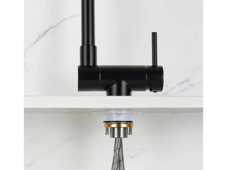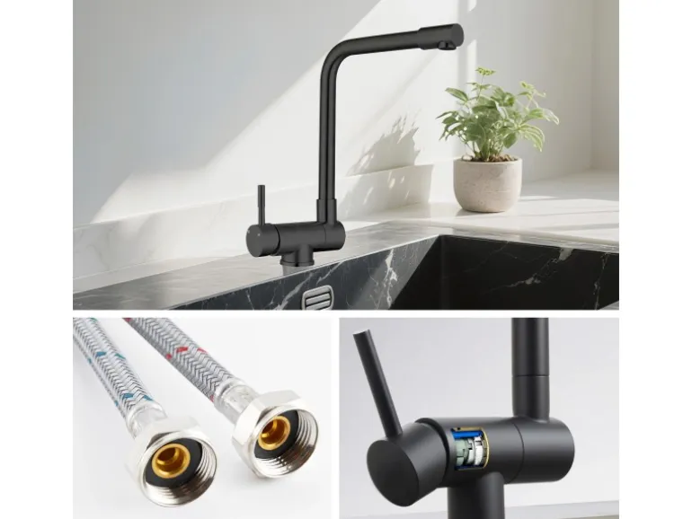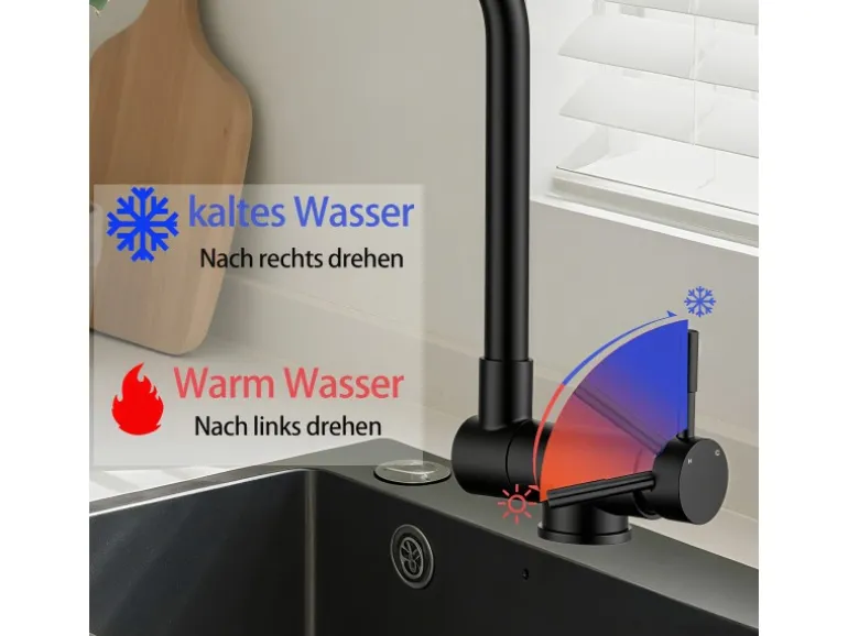 Lieferumfang: 1 x Küchenarmatur, 2 x Flexible Anschlussschläuche G3/8″, 1 x Installationspaket