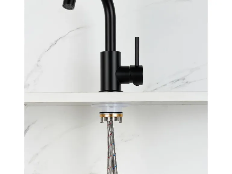 Lieferumfang: 1x Waschtischarmatur, 2x Flexible Anschlussschläuche G3/8″, 1x Installationspaket.