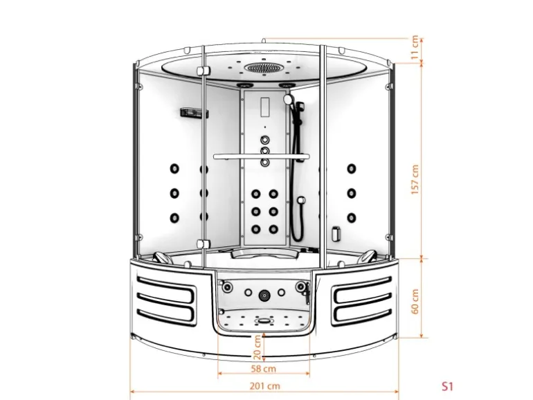– 18x Rückenmassagedüsen in den Glasrückwänden und im Duschpaneel