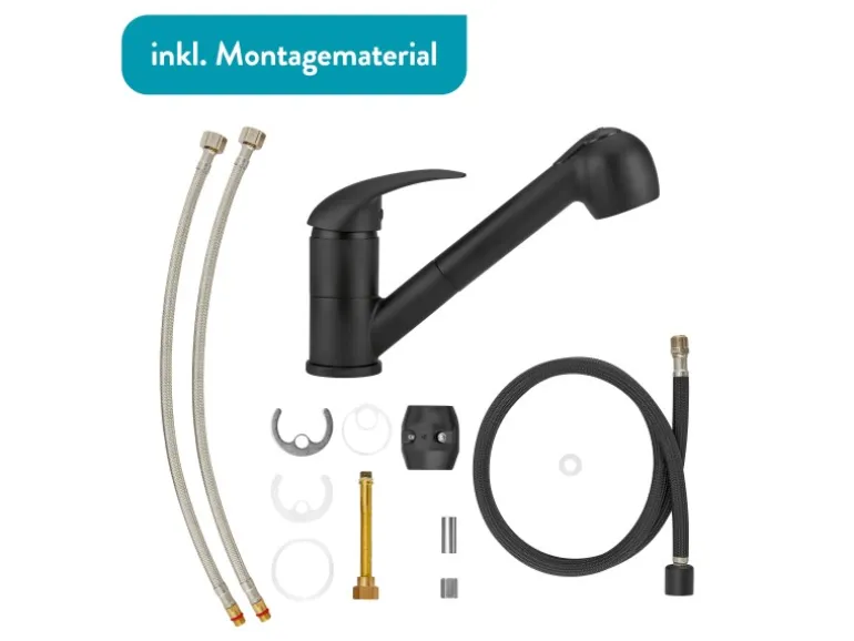 Einen weichen Wasserstrahl bietet dir die enthaltene Mischdüse. Und da wir dir eine hochwertige Kartusche mit keramischen Dichtscheiben bereits verbaut haben, kannst du nach dem Einbau sofort loslegen. Und weil du eine Küche willst, die lange hält, besteht die Armatur aus solidem Messing. Für ein schickes Aussehen besitzt die Armatur eine schwarz matte Oberfläche. Und damit du bei der Montage nicht unnötig Zeit verschwenden musst, legen wir der Armatur alles an Material bei, das du dafür brauchst.