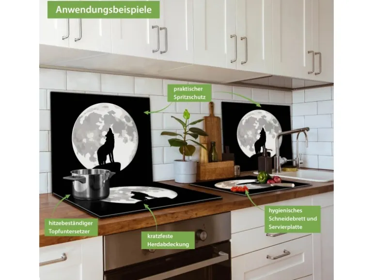 Banjado Herdabdeckplatte Glas 1 Teilig 60x52CM Schneidebrett Herdabdeckung Mit Motiv Heulender Wolf Sw