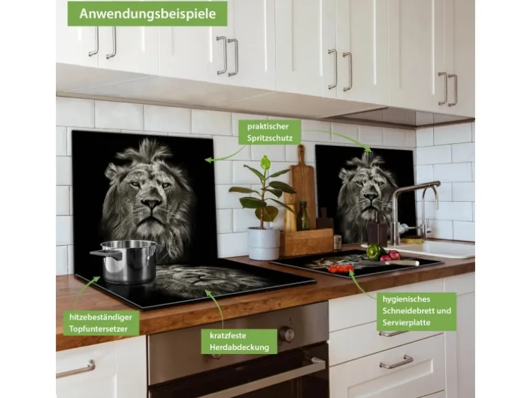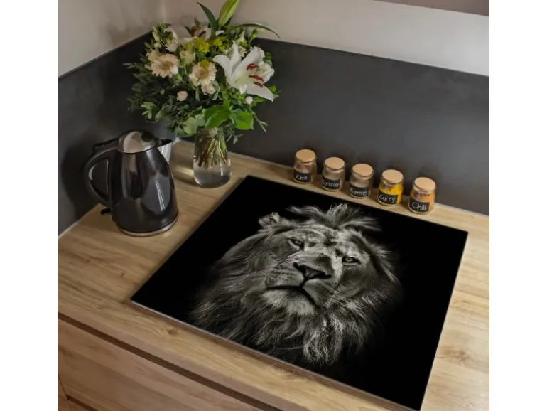 Banjado Herdabdeckplatte Glas 1 Teilig 60x52CM Schneidebrett Herdabdeckung Mit Motiv Löwe Porträt