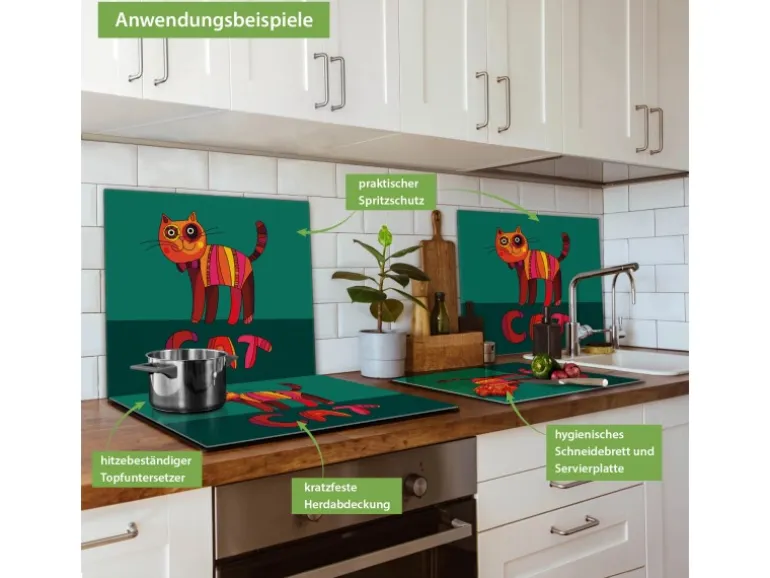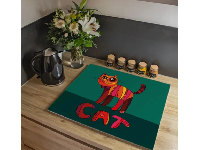 Banjado Herdabdeckplatte Glas 1 Teilig 60x52CM Schneidebrett Herdabdeckung Mit Motiv Orange Katze