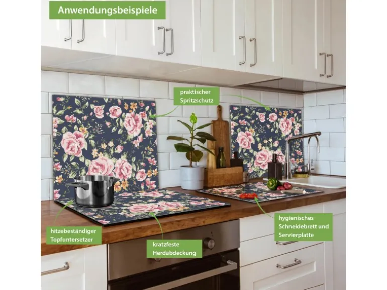 Banjado Herdabdeckplatte Glas 1 Teilig 60x52CM Schneidebrett Herdabdeckung Mit Motiv Rosen Auf Anthrazit