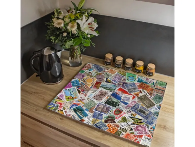 Banjado Herdabdeckplatte Glas 2 Teilig Je 30x52CM Schneidebrett Herdabdeckung Mit Motiv Briefmarken