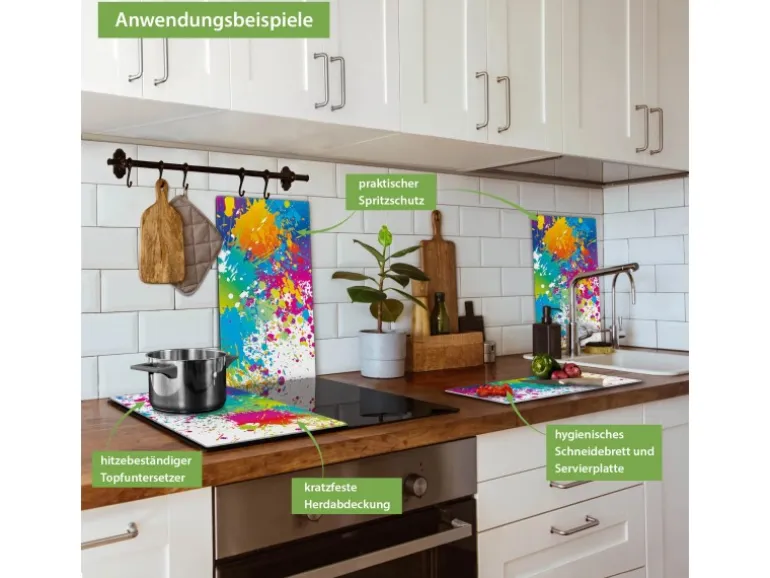 Banjado Herdabdeckplatte Glas 2 Teilig Je 30x52CM Schneidebrett Herdabdeckung Mit Motiv Farbspritzer