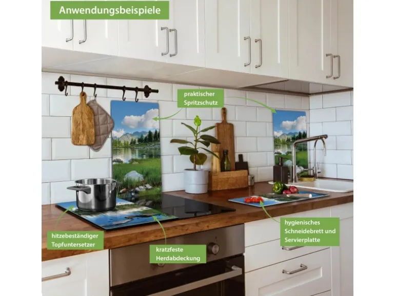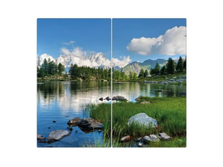 Banjado Herdabdeckplatte Glas 2 Teilig Je 30x52CM Schneidebrett Herdabdeckung Mit Motiv Gebirgssee