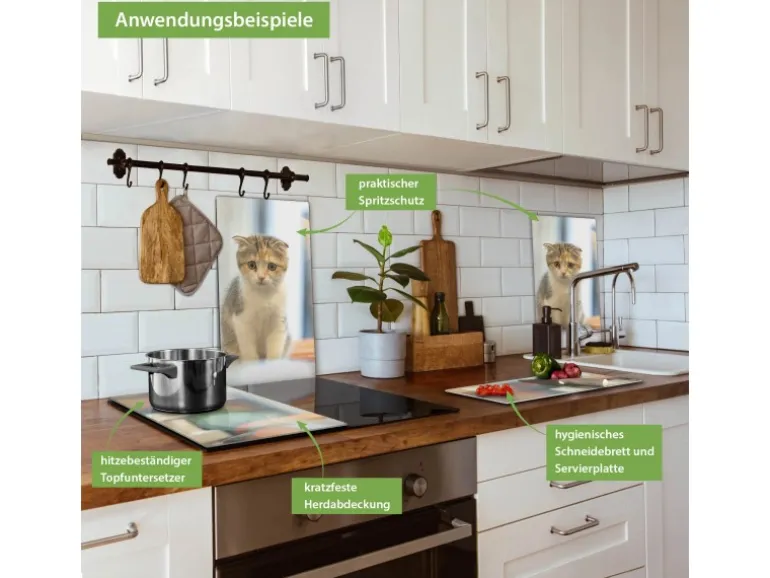 Banjado Herdabdeckplatte Glas 2 Teilig Je 30x52CM Schneidebrett Herdabdeckung Mit Motiv Kleine Katze