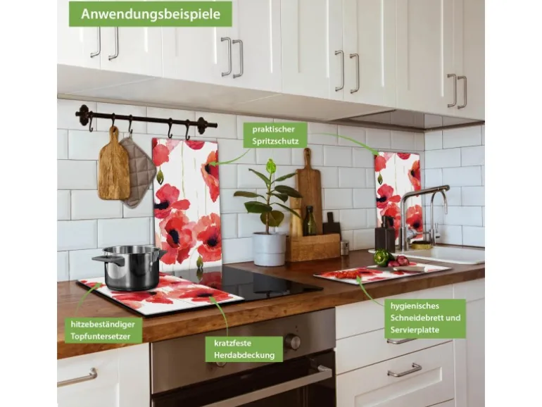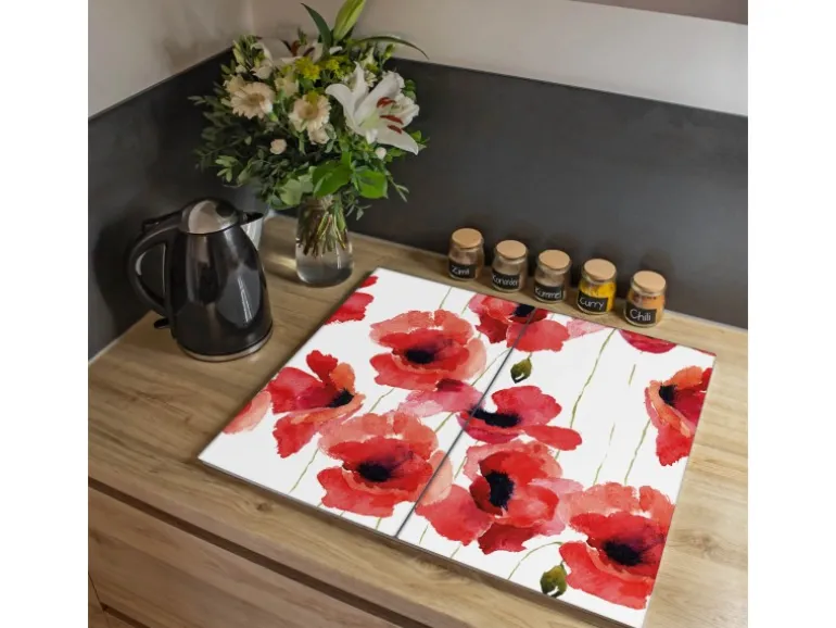 Banjado Herdabdeckplatte Glas 2 Teilig Je 30x52CM Schneidebrett Herdabdeckung Mit Motiv Mohn Aquarell
