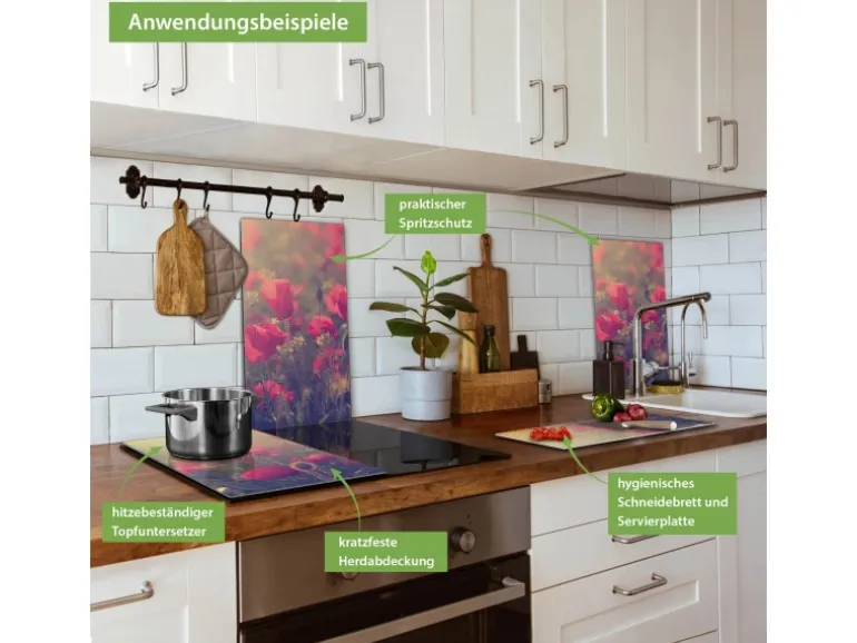 Banjado Herdabdeckplatte Glas 2 Teilig Je 30x52CM Schneidebrett Herdabdeckung Mit Motiv Mohn