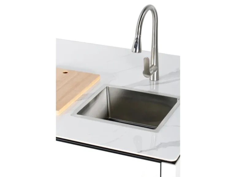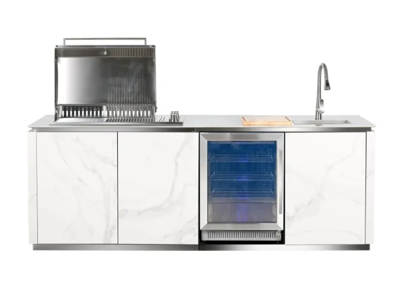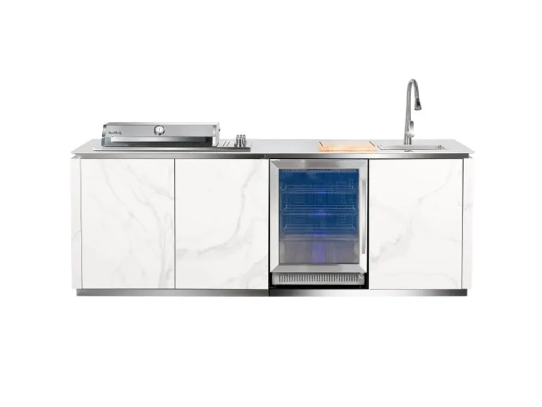 Die hochwertige Verarbeitung dieser Outdoorküche garantiert Langlebigkeit und Beständigkeit. Die weiße Keramik-Arbeitsplatte und Fronten sind wasserabweisend, kratzfest und UV-beständig. Der Korpus besteht aus robustem Edelstahl.