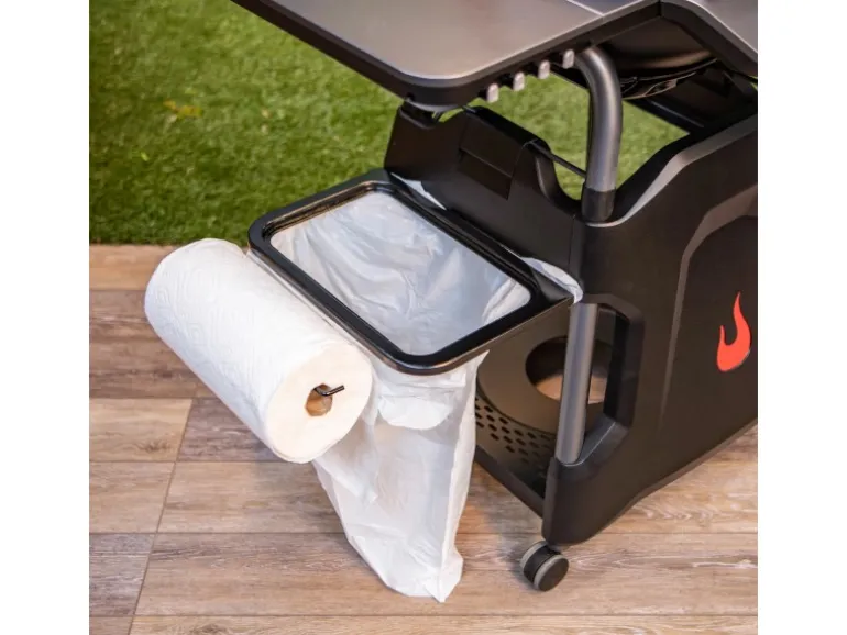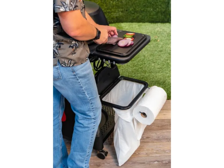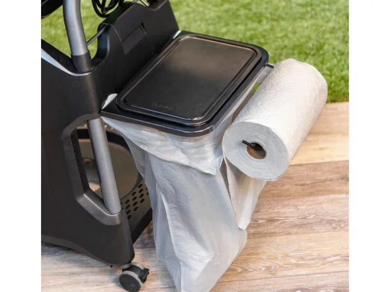 Die Ablage dient als Rahmen für die Befestigung einer Mülltüte ebenso wie als Küchenrollenhalterung. Im Lieferumfang ebenfalls enthalten ist ein Schneidbrett, das genau in den Rahmen der Halterung passt. So kann es ideal als Erweiterung der Arbeitsfläche beim Grillen genutzt werden. Da das Brett ebenfalls auf die Seitenablagen des All-Star Grill passt, ermöglicht es darüber hinaus die Verwendung zum Schneiden von Gemüse oder Fleisch. Das ist besonders praktisch, wenn sich die Mülltüte direkt darunter befindet. So können Sie Küchenabfälle direkt entsorgen.