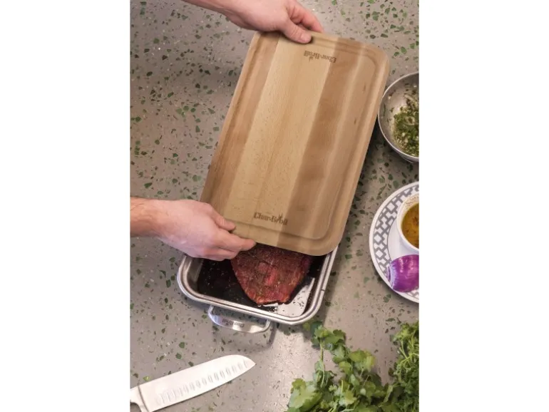 Das Schneidebrett ist ebenso vielfältig verwendbar wie die Grillschale. Auf dem Küchenbrett können Sie jegliche Speisen bequem zubereiten. Die umlaufende Rinne sorgt dafür, dass Bratensaft von großen Bratenstücken oder Steaks aufgefangen wird und sich nicht auf der Schneidefläche ansammelt. So bleibt das Fleisch schön knusprig. Das dekorative Holzbrett eignet sich gleichermaßen zum Anrichten von fertigen Gerichten oder auch als Brotzeitbrett. Die rustikale Optik setzt Ihr Essen gekonnt in Szene. Das Brett ist zudem ideal auf die Bratschale abgestimmt und kann als Abdeckung für die Schale genutzt werden.