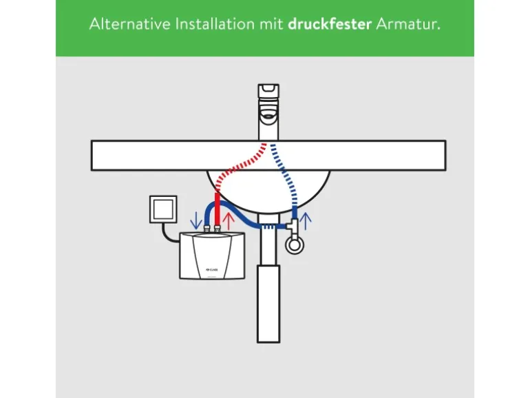 Dank des zum Lieferumfang gehörenden Anschlusssets (inkl. flexiblem Druckschlauch, T-Stück und Spezialstrahlreglern) ist die Installation unkompliziert. Der MCX7 kann sowohl mit einer druckfesten als auch einer drucklosen Armatur betrieben werden.