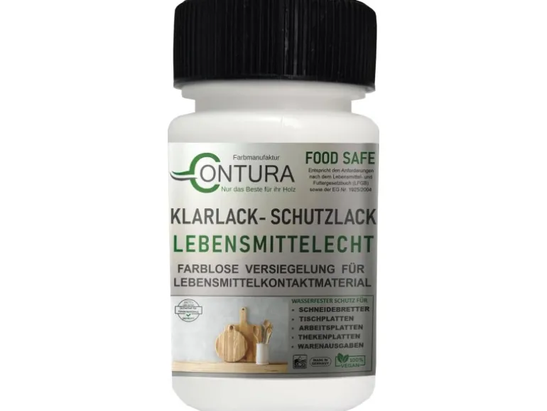 Contura lebensmittelechter Lack (nach Anforderung des LFGB -Lebensmittel und Futtermittelgesetzbuch- sowie Verordnung Nr. 1935/2004) ist ein spezieller Lack, der für den Kontakt mit Lebensmitteln geeignet ist. Verwendet wird dieser Lack für Materialien und Gegenstände wie zum Beispiel Schneidebretter, Arbeitsplatten, Tischplatten, Thekenplatten, Warenausgaben (Flächen), die dazu bestimmt sind, mit Lebensmitteln in Berührung zu kommen.