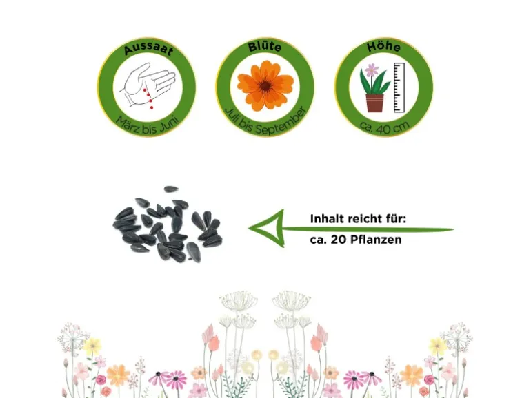 Einjährige, niedrige Sorte mit gelbem Herzen, wird ca. 40 cm hoch. Ideal für Töpfe, Kübel und Balkonkästen geeignet.Aussaat: Vorkultur von März bis April oder ab Mitte Mai bis Juni direkt ins Freiland säen. Etwa 2-3 cm tief in Aussaaterde einsetzen.Keimung: Keimt ab 15°C nach 7-14 Tagen. Ab Mitte Mai nach dem letzten Frost abhärten und ins Freiland setzen.Blüte: Blüht von Juli bis September.Standort: Sonniger Standort mit durchlässigem, nährstoffreichem Boden. Ausreichend wässern und nachdüngen.Inhalt: reicht für ca. 20 Pflanzen