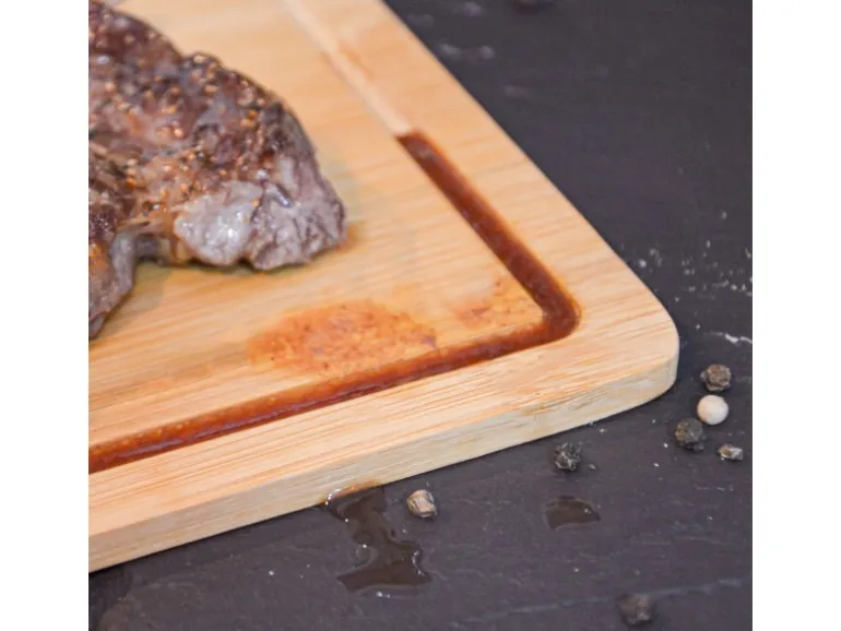 Die Holzbrettchen sind beidseitig verwendbar. Vorne mit Saftrille, hinten mit glatter Fläche.