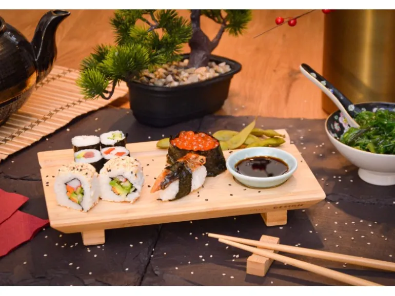 Selbstgemacht oder bestellt – Sushi schmeckt immer: Mit den traditionellen Holztellern verwandelst Du Deinen Esstisch in ein japanisches Restaurant.