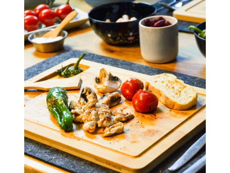 Die dicken Bambus Brettchen halten einiges an Hitze aus – und sind hygienisch und antibakteriell.