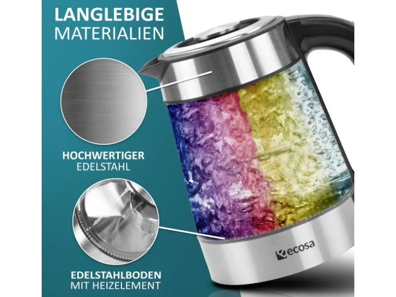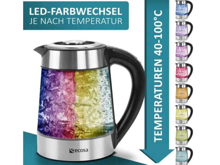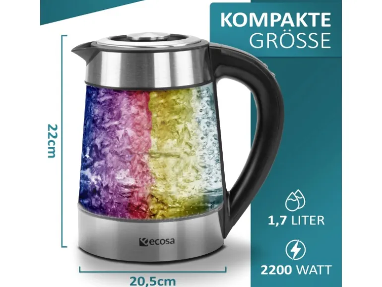 Dieser praktische und stilvolle Wasserkocher besticht durch ein außergewöhnliches Design, mit zeitlosem Material aus Glas und hochwertigem Edelstahl. Nicht weniger beeindruckend ist die LED-Beleuchtung, sowie das LCD-Display.