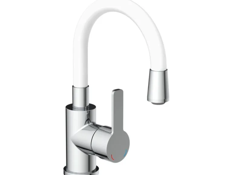 Elegante Waschtischarmatur mit hohem Rundbogenauslauf in der Trendfarbe Chrom-Weiß