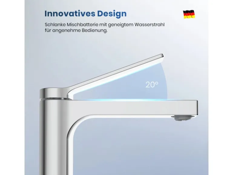 Elegantes Design: Armatur mit ergonomischem, geneigtem Griff für komfortable Handhabung.