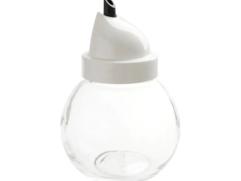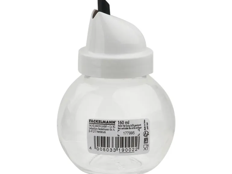 Der Fackelmann Basic Allesgießer fasst 160 ml Zucker (Ø 7,5 x 10 cm). Er besitzt einen runden Glaskörper sowie einen weiß/schwarzen Ausgießer aus Kunststoff und ist spülmaschinengeeignet.
