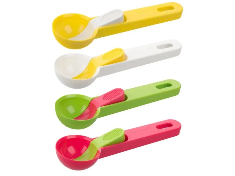 Der Fackelmann Eisportionierer aus Kunststoff hat eine Länge von 19 cm und ist spülmaschinengeeignet. Der Portionierer ist in den Farbkombinationen Gelb-Weiß und Koralle-Grün erhältlich.