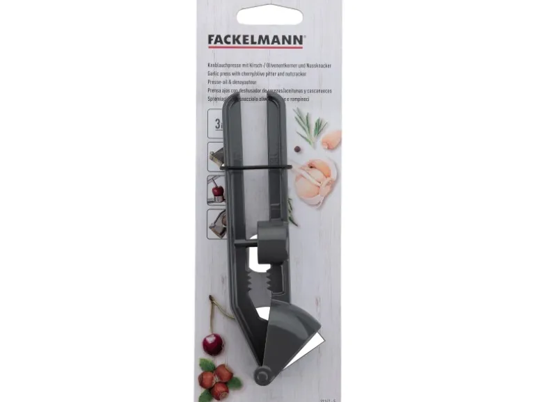 Die Fackelmann Knoblauchpresse 3 in 1 aus Aluminium v Knoblauchpresse, Kirch/Olivenentsteiner und Nussknacker, 155mm, leichte Reinigung per Hand