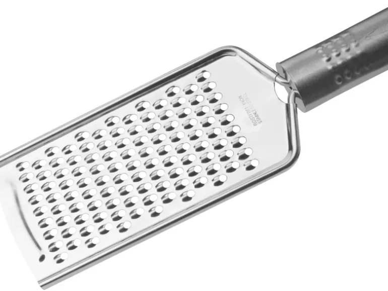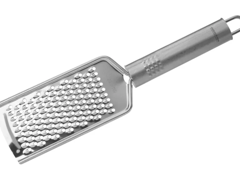 Die Fackelmann Reibe mit Ovalgriff aus Edelstahl hat eine Länge von 24 cm und ist spülmaschinengeeignet.