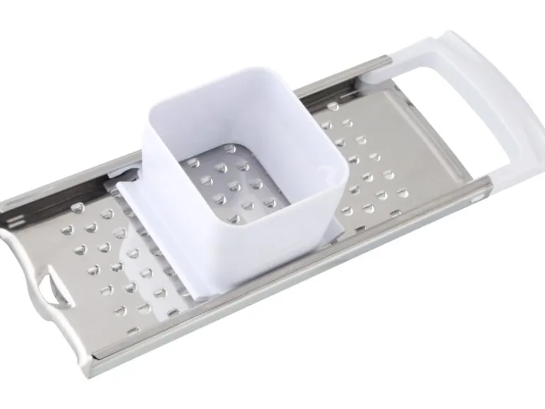 Der Fackelmann Spätzlehobel Arcadalina mit Griff und Schieber aus weißem Kunststoff, Reibe aus Edelstahl ist spülmaschinengeeignet.