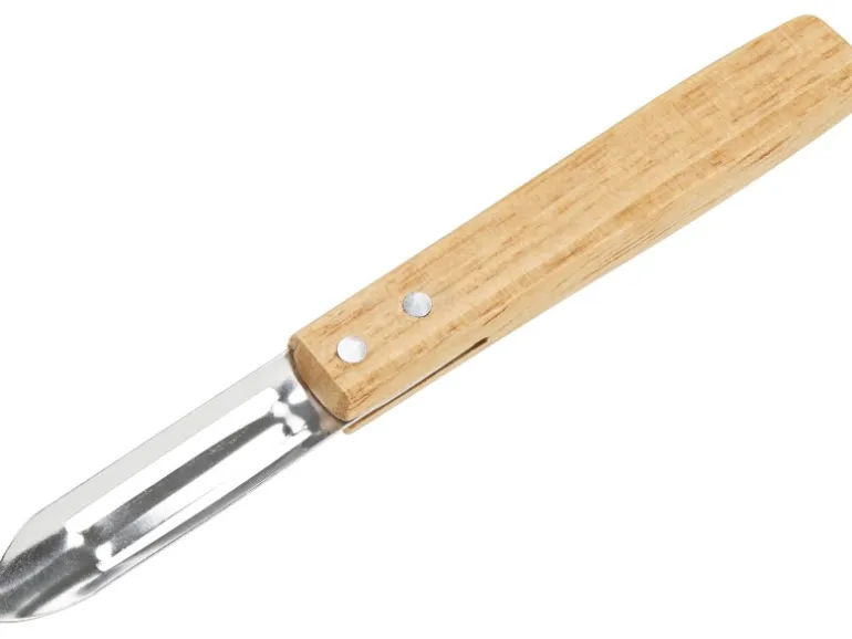 Der Fackelmann Sparschäler Nirosta Country mit einem Griff aus Rosenholz und Klinge aus Edelstahl hat die Maße von 60 mm x 157 mm.