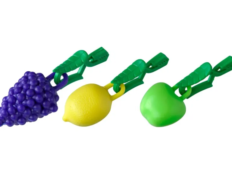 Die Fackelmann Tischtuchhänger bestehen aus ABS-Kunsstoff und verfügen über einen Clip im Blattdesign. Das Set besteht aus den Formen Apfel, Zitrone und Traube.