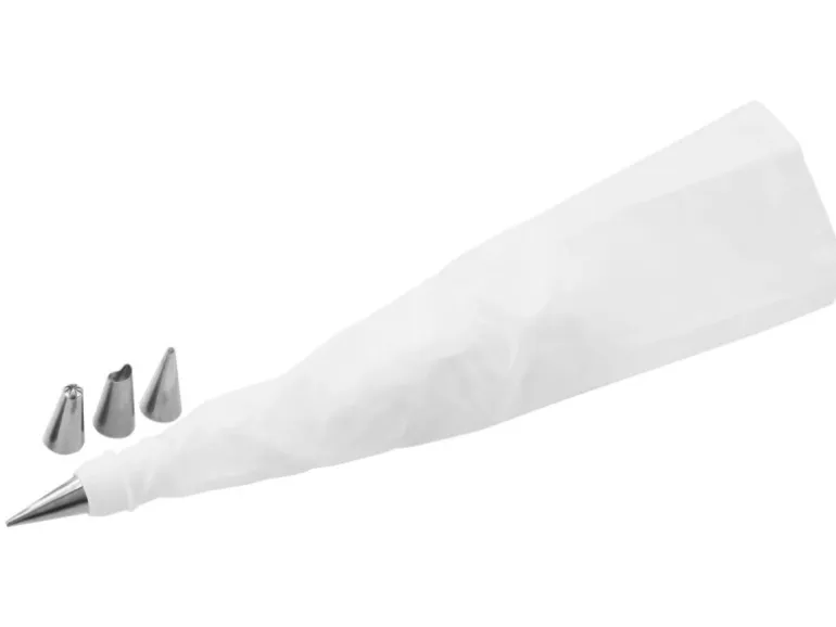 Der Fackelmann Zenker Patisserie Spritzbeutel mit 4 Edelstahltüllen hat eine Größe von 31 cm x 18 cm. Der Beutel ist aus extra-starkem Material gefertigt und die Tüllen bestehen aus Edelstahl mit einer Höhe von 3,5 cm.