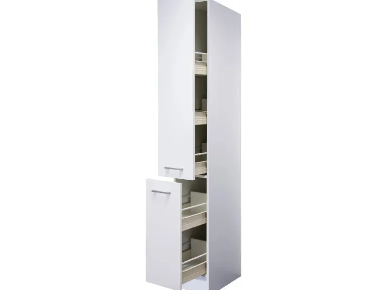 Der 30 cm breite und 200 cm hohe Schrank bietet Ihnen jede Menge Stauraummöglichkeiten für Ihre Küchenutensilien und Vorräte. Durch die zwei Auszüge und insgesamt fünf Ablagen schaffen Sie Ordnung und verstauen Lebensmittel blickdicht.