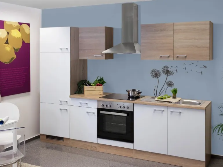 Die 270 cm breite Küchenzeile besteht aus (BxHxT):