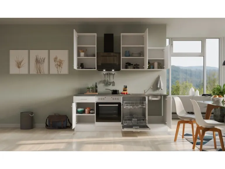 Ein 55 cm und zwei 89 cm hohe Hängeschränke mit bis zu zwei Einlegeböden bieten reichlich Platz für Geschirr und Gläser. Im Unterschrank mit Schublade und einem Einlegeboden finden Besteck, Töpfe und/oder Vorräte ihren Platz. Auch im geräumigen Spülenunterschrank lässt sich noch manches Küchen- und Putzutensil problemlos unterbringen. Und wenn es wirklich einmal mehr werden sollte, können Sie Ihre Küche einfach mit weiteren Schränken aus der Serie erweitern.