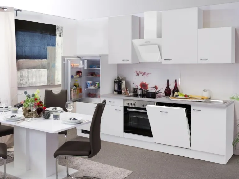Inkl. Einbaukühlschrank mit Gefrierfach EEK: E und Einbaubackofen EEK: A mit Glaskeramikkochfeld