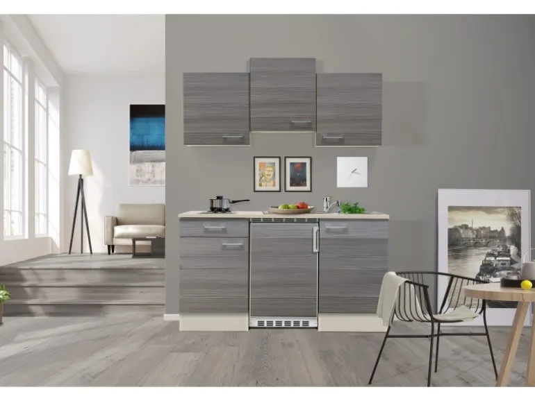 Klassische Singleküche mit pflegeleichter Kunststoff-Oberfläche in trendiger Holzoptik
