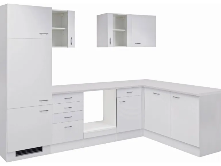 Drei 55 cm hohe Hängeschränke mit je einem Einlegeboden bieten reichlich Platz für Geschirr und Gläser. In dem Eck-Unterschrank und dem 50 cm breiten Unterschrank mit drei Schubkästen und einem Auszug finden Besteck, Töpfe und/oder Vorräte ihren Platz. Auch im hohen Geräteumbauschrank mit 88 cm hoher Kühlschranknische und drei Drehtüren und dem Spülenunterschrank steht genügend Fläche zur Verfügung, um noch mancherlei Küchen- und Putzutensil zu verstauen. Und wenn es wirklich einmal mehr werden sollte, können Sie Ihre Küche einfach mit weiteren Schränken aus der Serie ausbauen. Für den Einbau von Herd und vollintegriertem Geschirrspüler stehen die entsprechenden Umbauschränke und Blenden zur Verfügung.