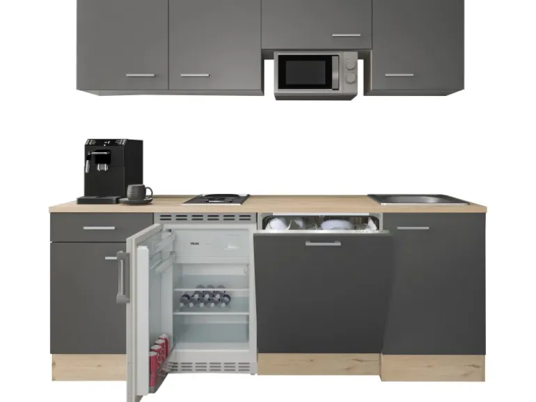 Der Unterschrank mit Schubkasten und Drehtür bietet zusammen mit den Hängeschränken viel Stauraum für Geschirr, Besteck und Vorräte. Auch im 50 cm breiten Spülenunterschrank finden noch so manche Putzutensilien ihren Platz. Die Türen der Schränke sind sowohl für den links- als auch rechtsseitigen Aufbau vorbereitet, was Ihnen ein Höchstmaß an Flexibilität bei der Montage bietet. Moderne Elektrogeräte, wie zum Beispiel ein vollintegrierter Geschirrspüler, eine Mikrowelle, ein kleines Kochfeld sowie ein Unterbau-Kühlschrank mit 3-Sternen Gefrierfach runden diese durchdachte Küchenzeile ab.