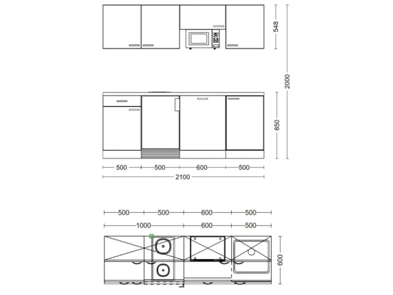 Die 210 cm breite Küchenzeile (B x H x T) besteht aus:
