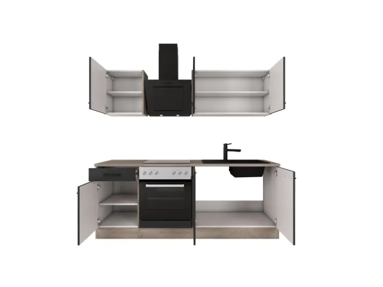 Gleich drei Hängeschränke mit jeweils einem Einlegeboden bieten reichlich Platz für Geschirr und Gläser. Im Unterschrank mit Schublade und Einlegeboden finden Besteck, Töpfe und/oder Vorräte ihren Platz. Auch im geräumigen Spülenunterschrank mit 86 cm großer Edelstahl-Einbauspüle lässt sich noch manches Küchen- und Putzutensil problemlos unterbringen. Und wenn es wirklich einmal mehr werden sollte, können Sie Ihre Küche problemlos mit weiteren Schränken aus der Serie erweitern.