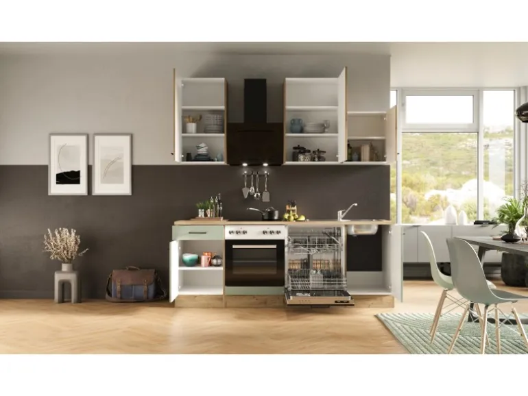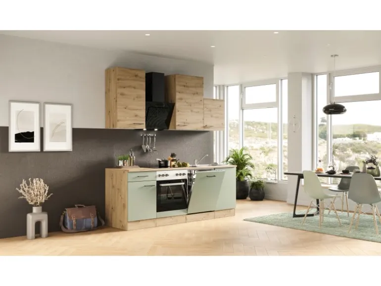 Flex-Well Küchenzeile mit pflegeleichter Anti-Fingerprint-Oberfläche in Schilfgrün (matt) und edler Holzoptik
