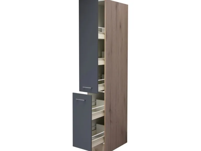 Der 30 cm breite Apothekerschrank Morena weiß durch eine hochwertige Verarbeitung sowie Materialauswahl zu gefallen und garantiert Ihnen auch auf kleinen Flächen ein Höchstmaß an Stauraum. Dabei verfügt der kompakte Apothekerschrank neben zwei Auszügen auch über fünf Ablagen.