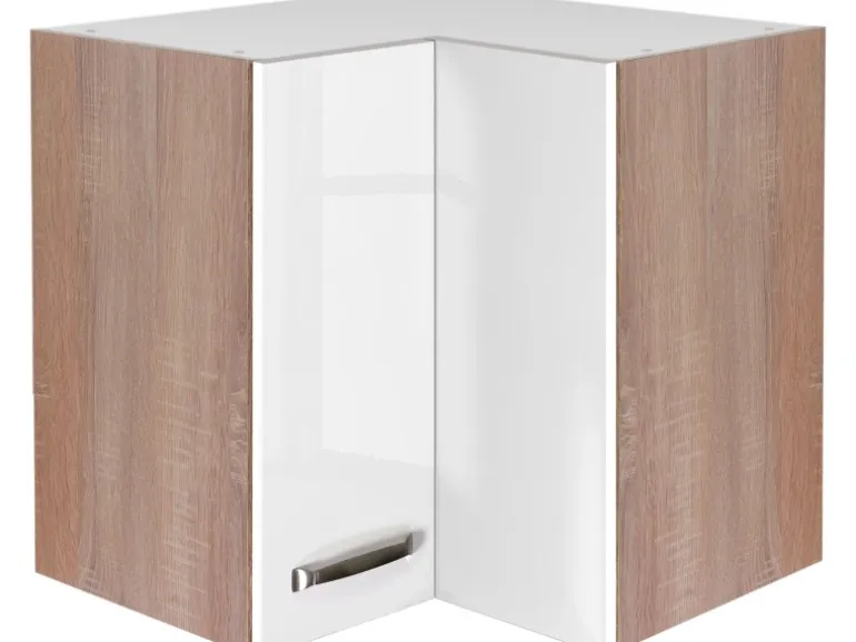 Der Eck-Hängeschrank Valero überzeugt durch eine geradlinige Formgebung und zeichnet sich durch ein helles und freundliches Ambiente aus. Dabei bietet Ihnen der hochwertige Eck-Hängeschrank ein reizvolles Dekor in der Farbe Hochglanz Weiß kombiniert mit Sonoma Eiche und eignet sich optimal als passende Ergänzung zur Küchenserie Valero .
