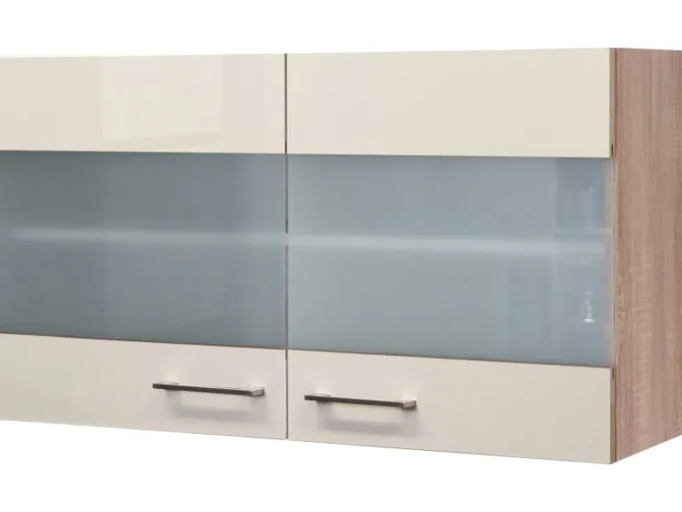 Der Glas-Hängeschrank Orlando überzeugt durch eine geradlinige Formgebung und zeichnet sich durch ein helles und freundliches Ambiente aus. Dabei bietet Ihnen der hochwertige Glas-Hängeschrank ein reizvolles Dekor in der Farbe Kaschmir Glanz kombiniert mit Sonoma Eiche und eignet sich optimal als passende Ergänzung zur Küchenserie Orlando.